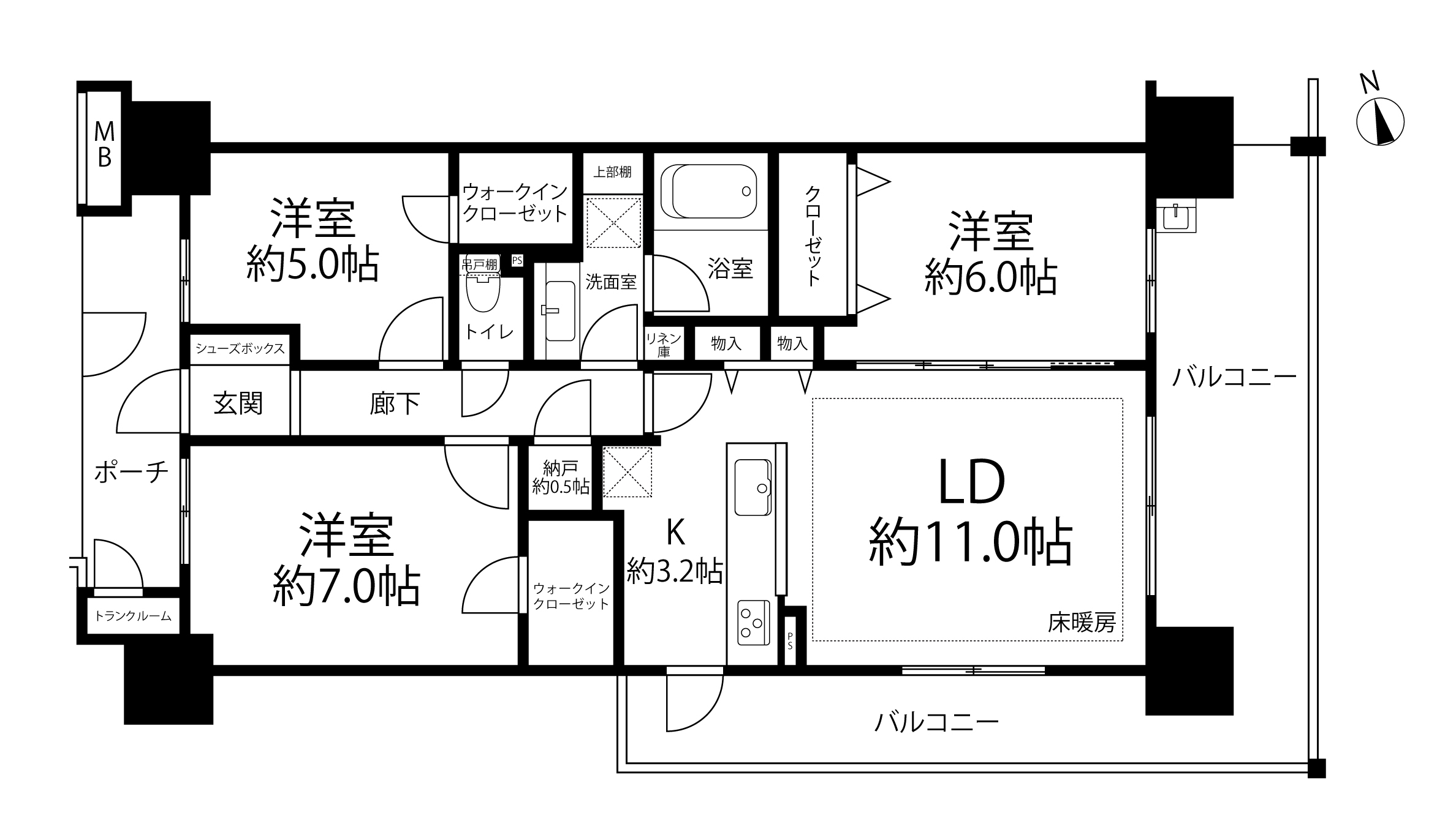 - ・2面採光LDK、L字バルコニー、豊富な収納(2WIC、納戸、トランクルーム)、ペット飼育可(細則有)